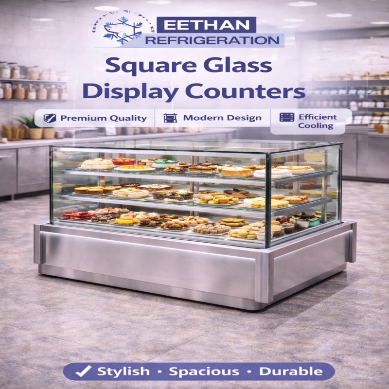Eethan Refrigeration is a trusted Square Glass Display Counters manufacturer in Bangalore, Karnataka, providing high-quality display solutions for bakeries, sweet shops, cafes, restaurants, and food retail outlets. Our display counters are designed to enhance product visibility while maintaining optimal temperature and freshness.